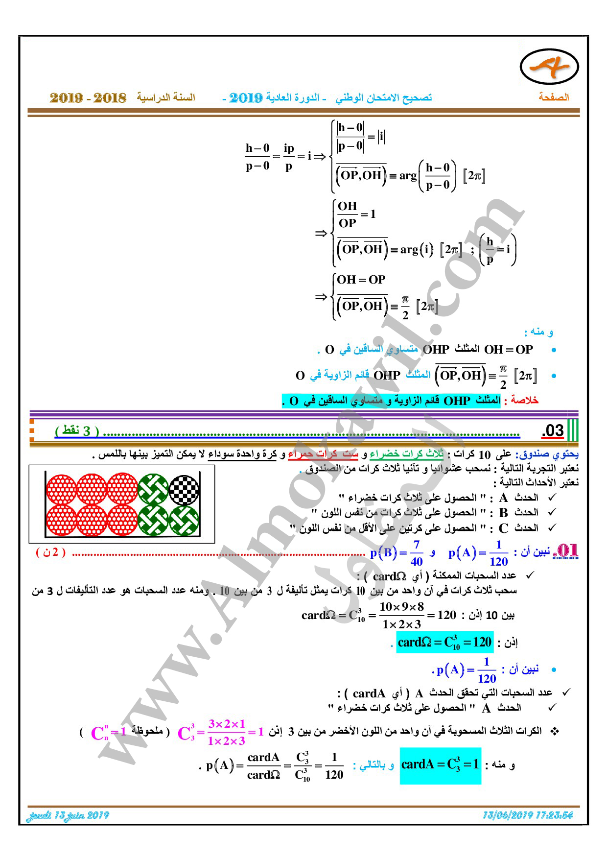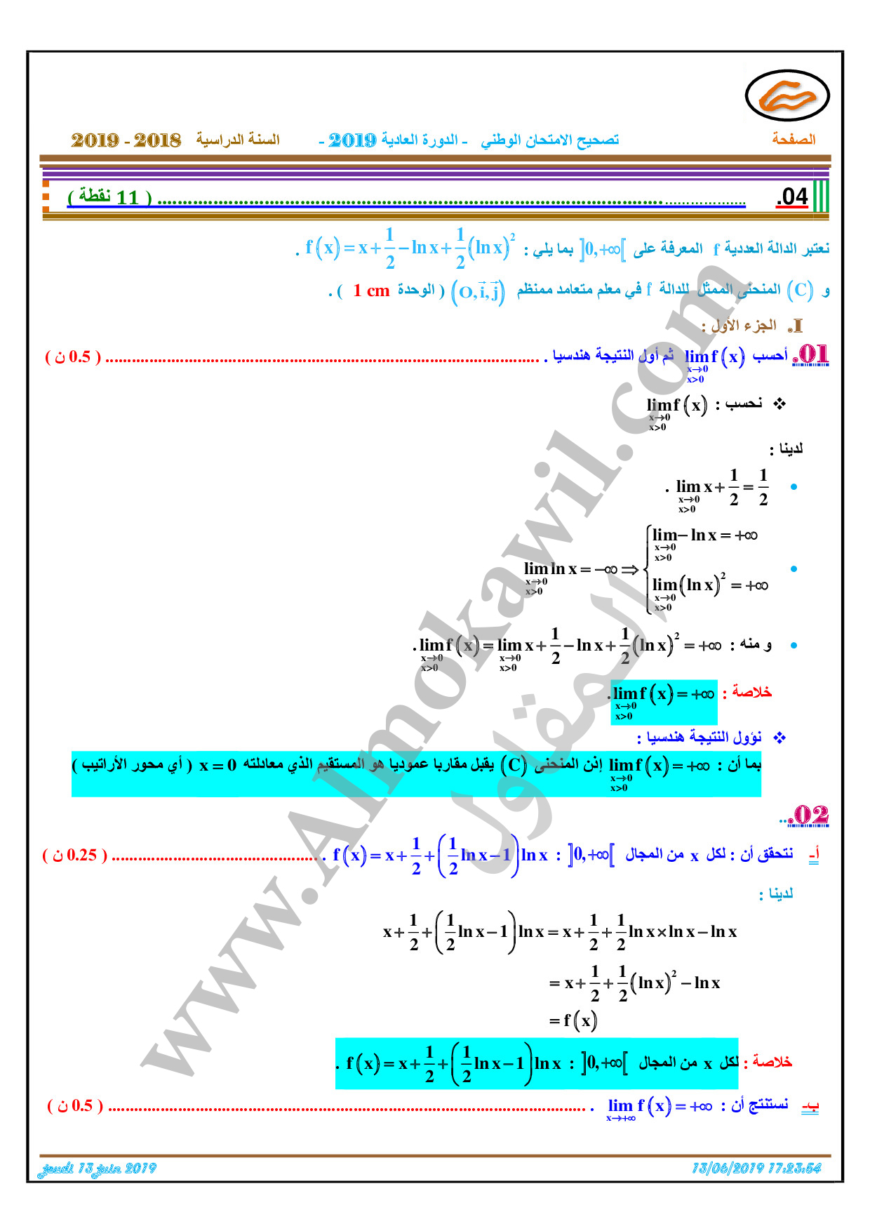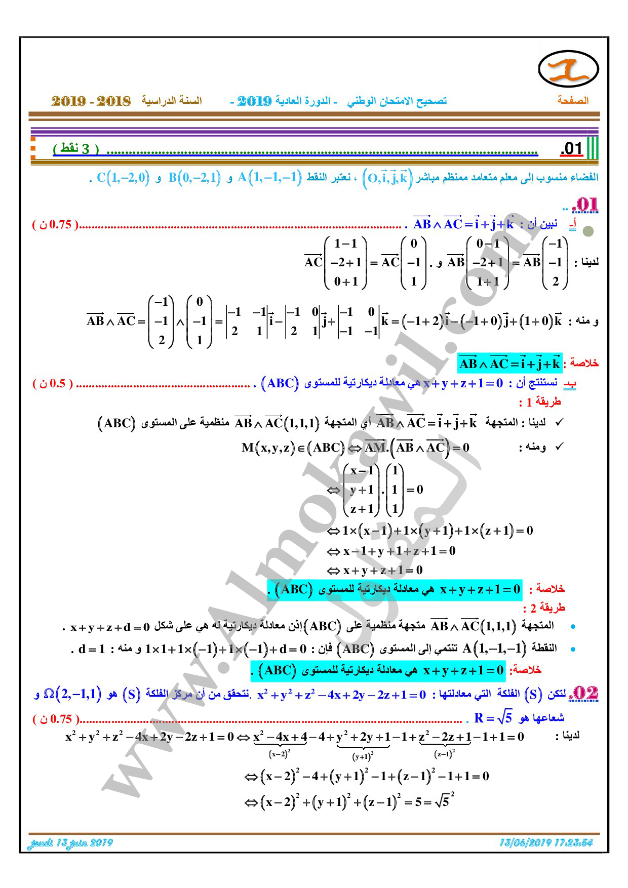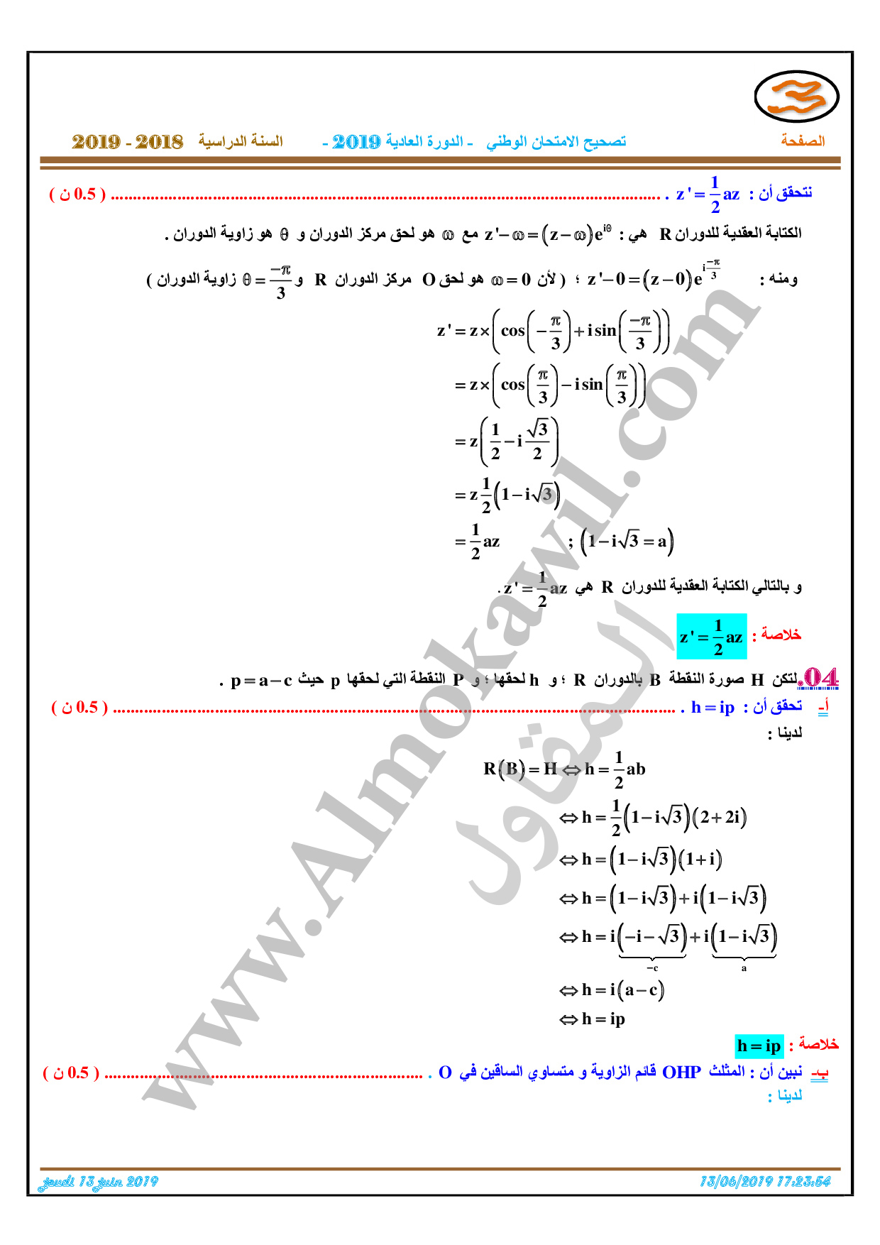تصحيح امتحان البكالوريا 2019 رياضيات