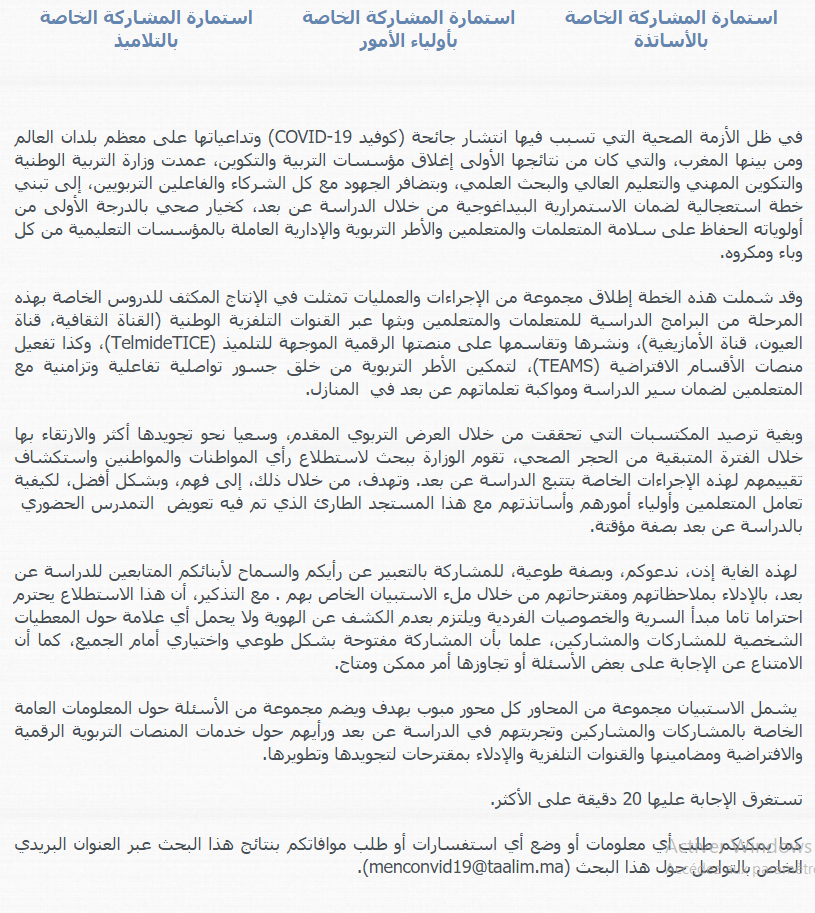 تقييم عملية التعلم عن بعد استمارة المشاركة الخاصة بالأساتذة استمارة المشاركة الخاصة بأولياء الأمور استمارة المشاركة الخاصة بالتلاميذ
